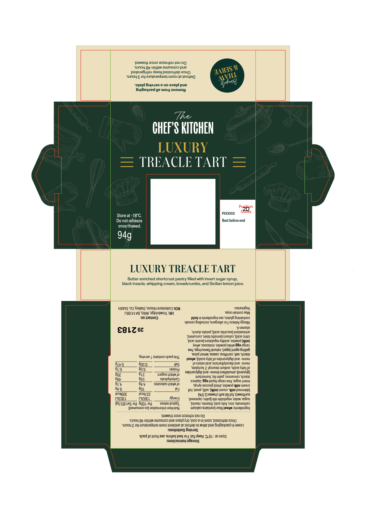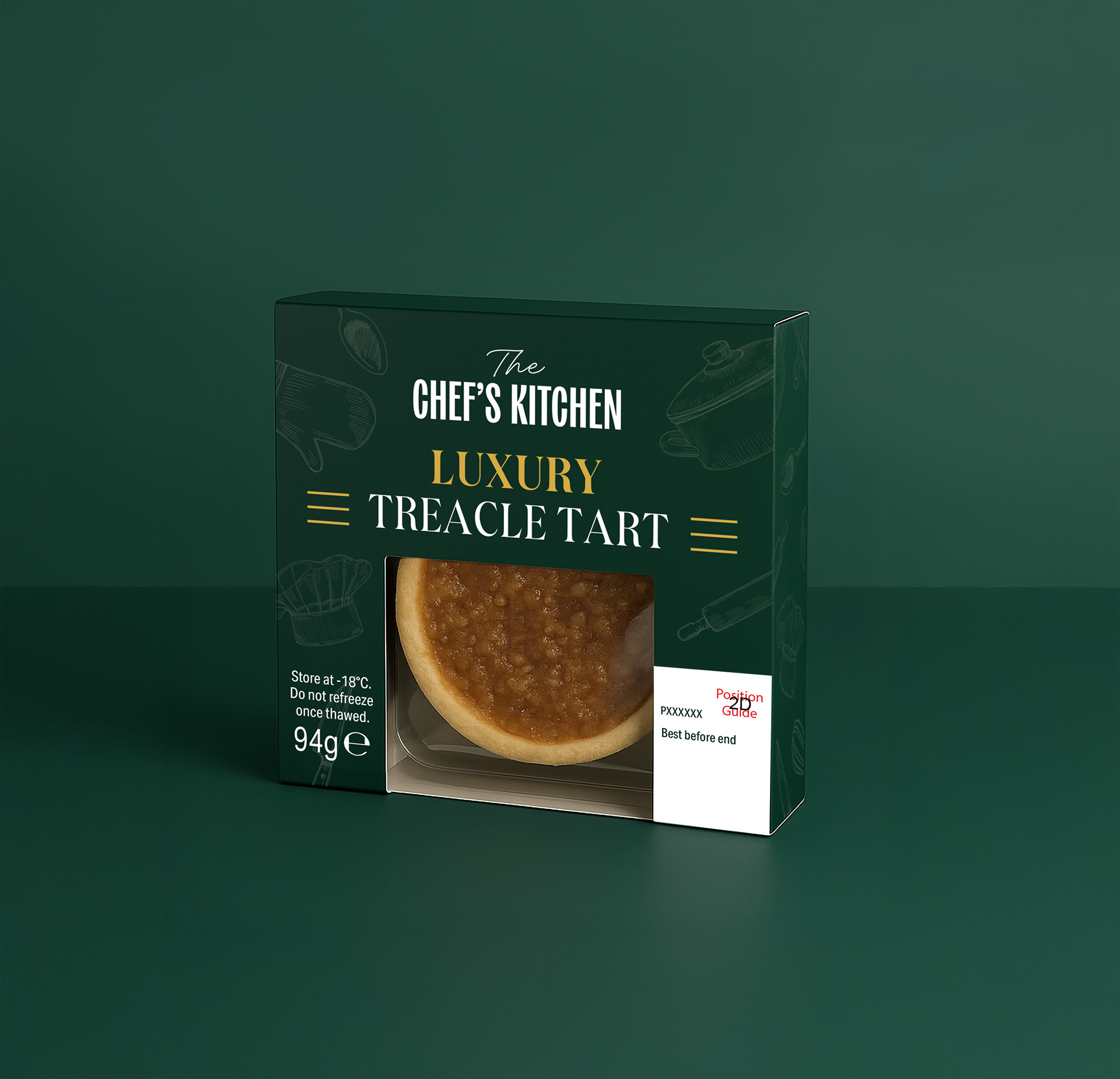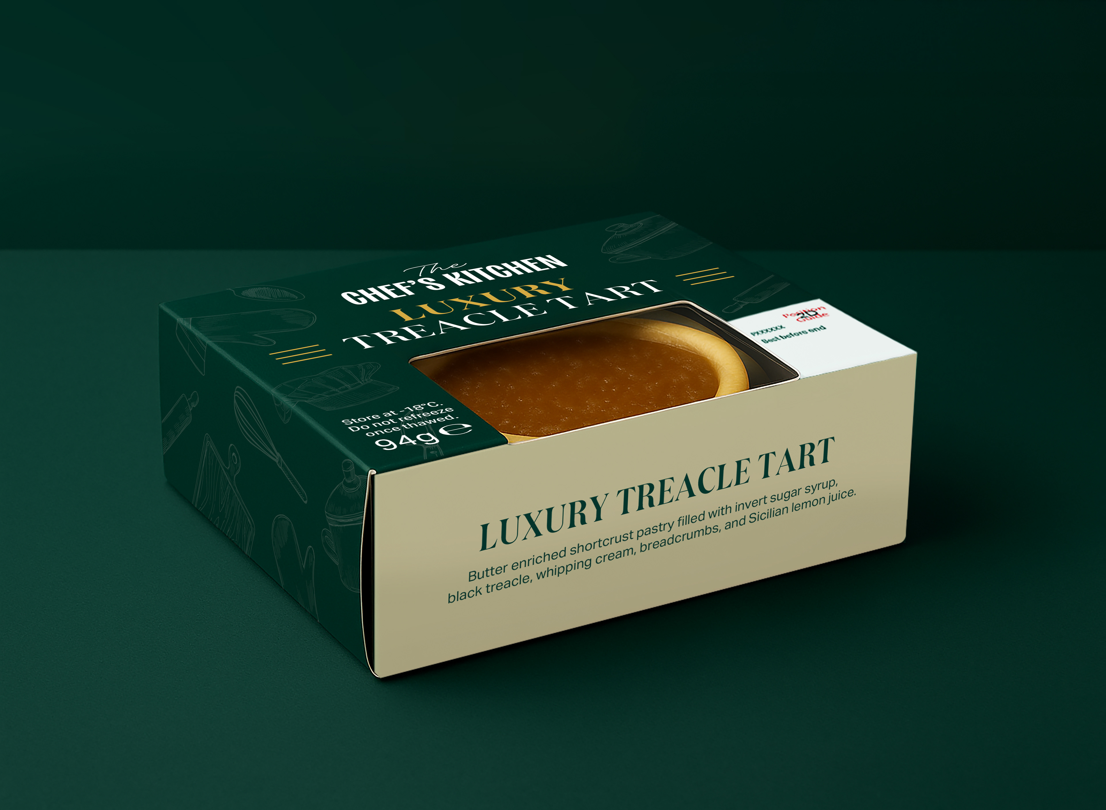 Concept-to-production packaging design for Wiltshire Farm Foods’ Chef’s Kitchen range, delivering an elevated, premium aesthetic for the new and improved Luxury Treacle Tart while adhering to established brand guidelines.