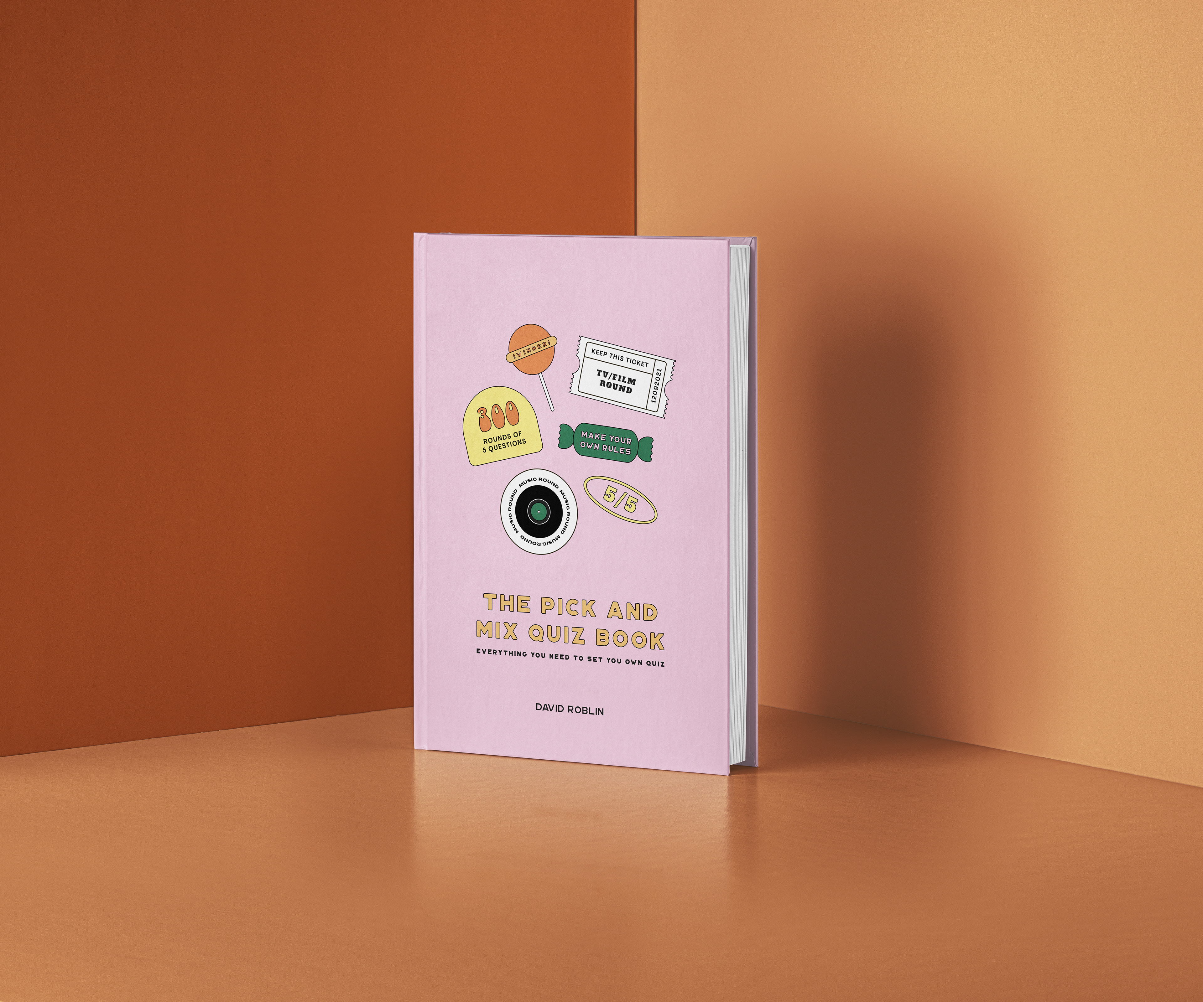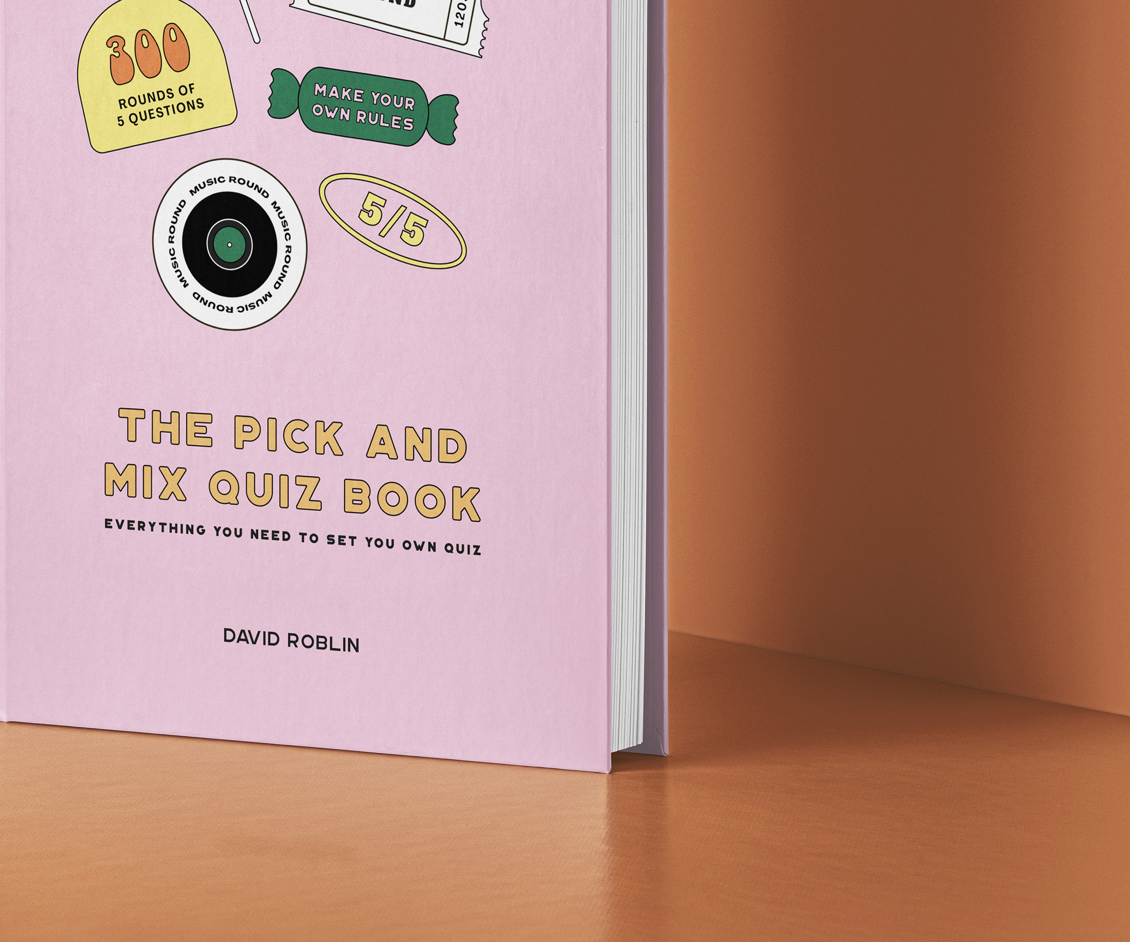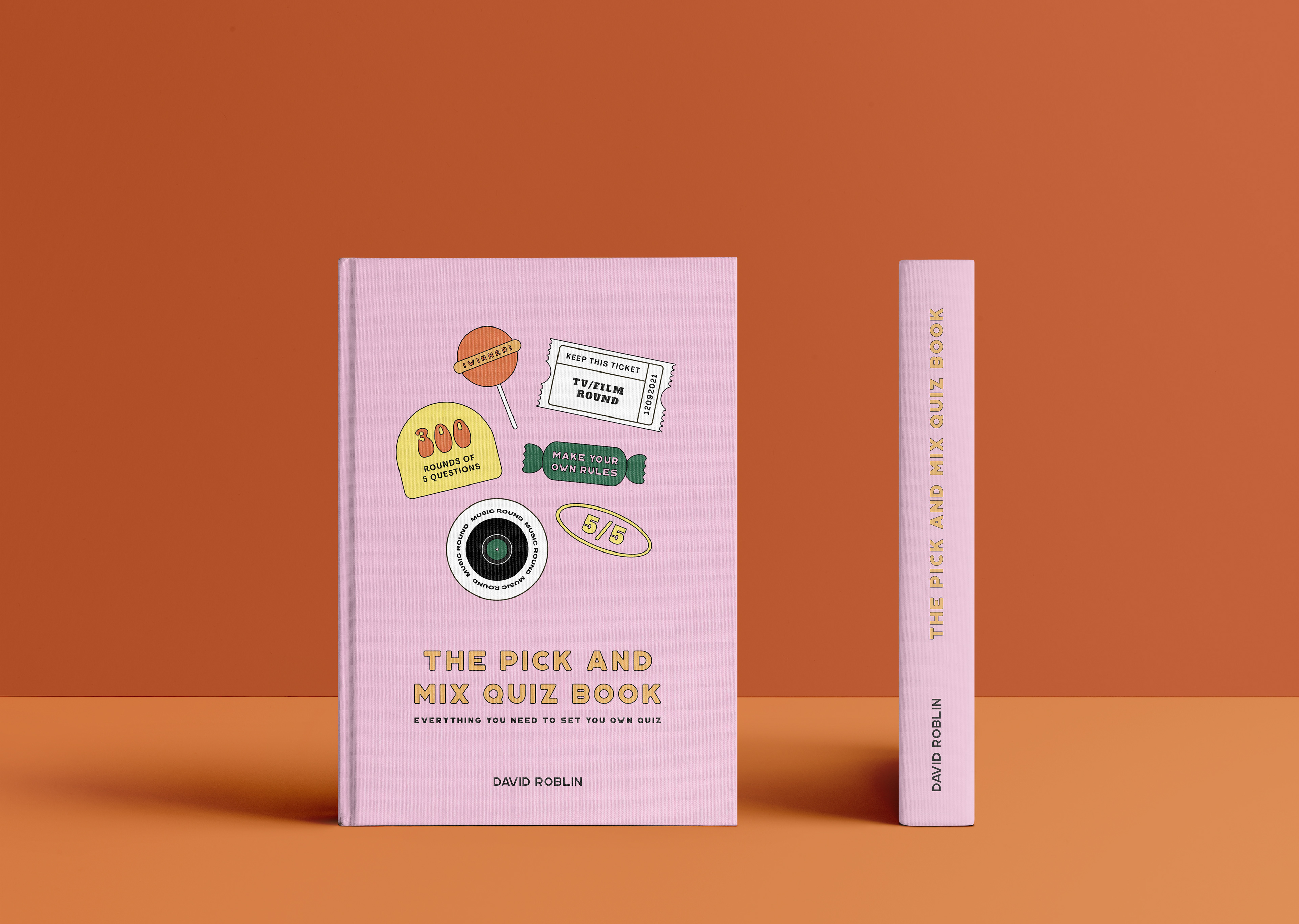 The pick and mix quiz book cover, juxtaposing modern typography and traditional sweetshop imagery to target all ages with fun, bright design.